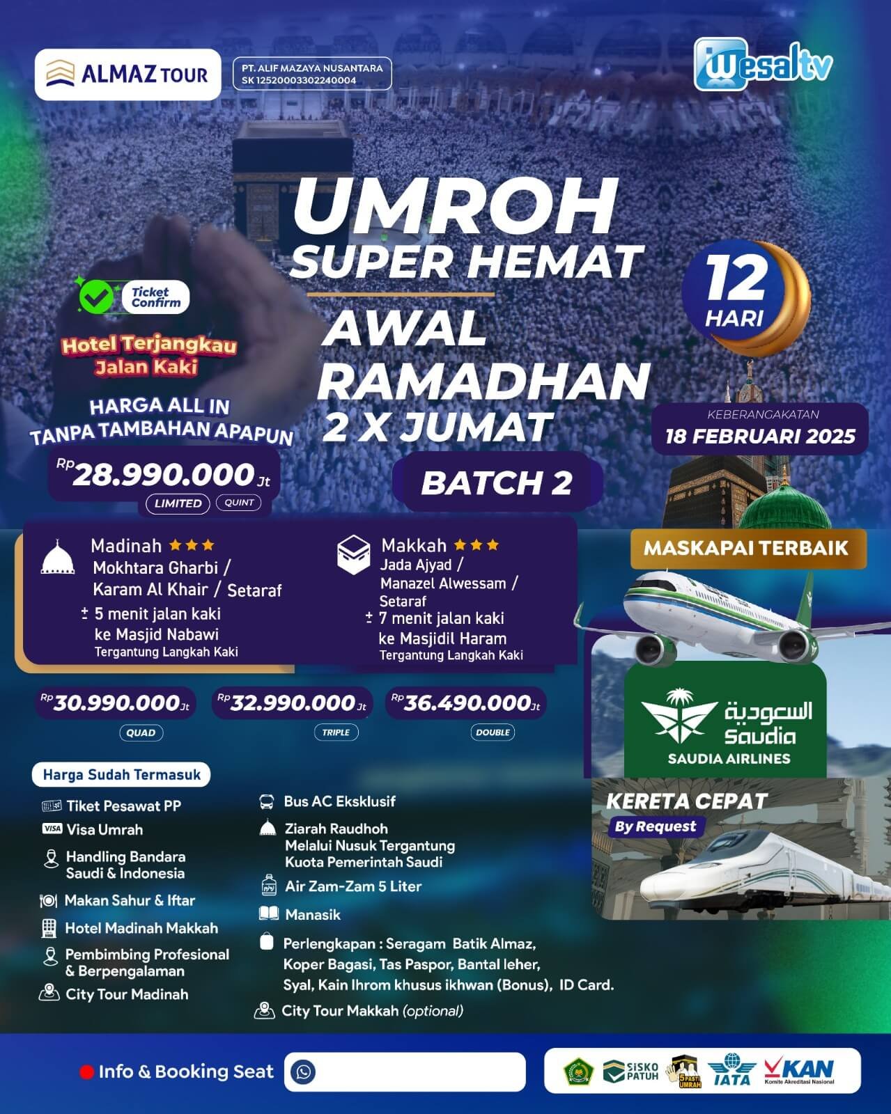 BATCH 2: UMROH AWAL RAMADHAN 12 HARI 28 JUTA-AN 2X JUM’AT SUPER HEMAT FEBRUARI 2026 / 1447 H Info Detail >>